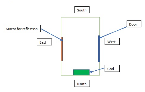 • In principle, west is end (sunset), east is door (sun is rising), north is temple and south is towards negativity.