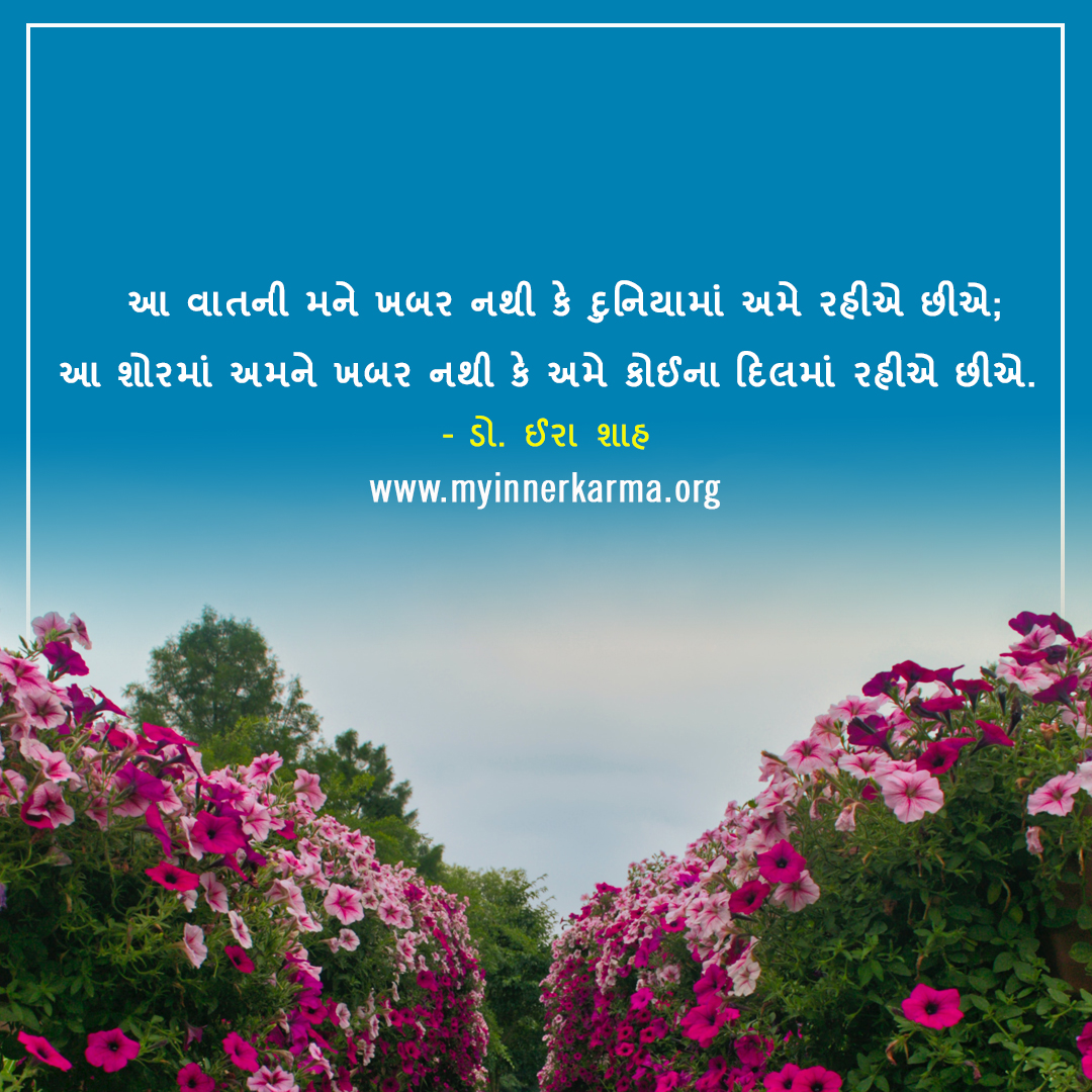 આ વાતની મને ખબર નથી કે દુનિયામાં અમે રહીએ છીએ; આ શોરમાં અમને ખબર નથી કે અમે કોઈના દિલમાં રહીએ છીએ. https://myinnerkarma.org/quotes/detail.aspx?title=a-vatani-mane-khabara-nathi-ke-duniyamam-ame-rahie-chhie
