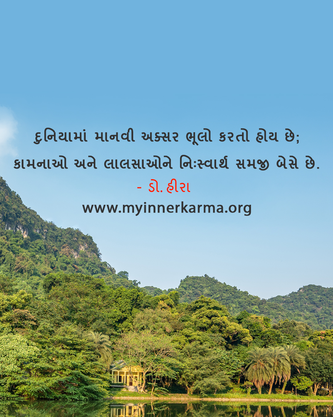 દુનિયામાં માનવી અક્સર ભૂલો કરતો હોય છે; કામનાઓ અને લાલસાઓને નિઃસ્વાર્થ સમજી બેસે છે. https://www.myinnerkarma.org/quotes/detail.aspx?title=duniyamam-manavi-aksara-bhulo-karato-hoya-chhe