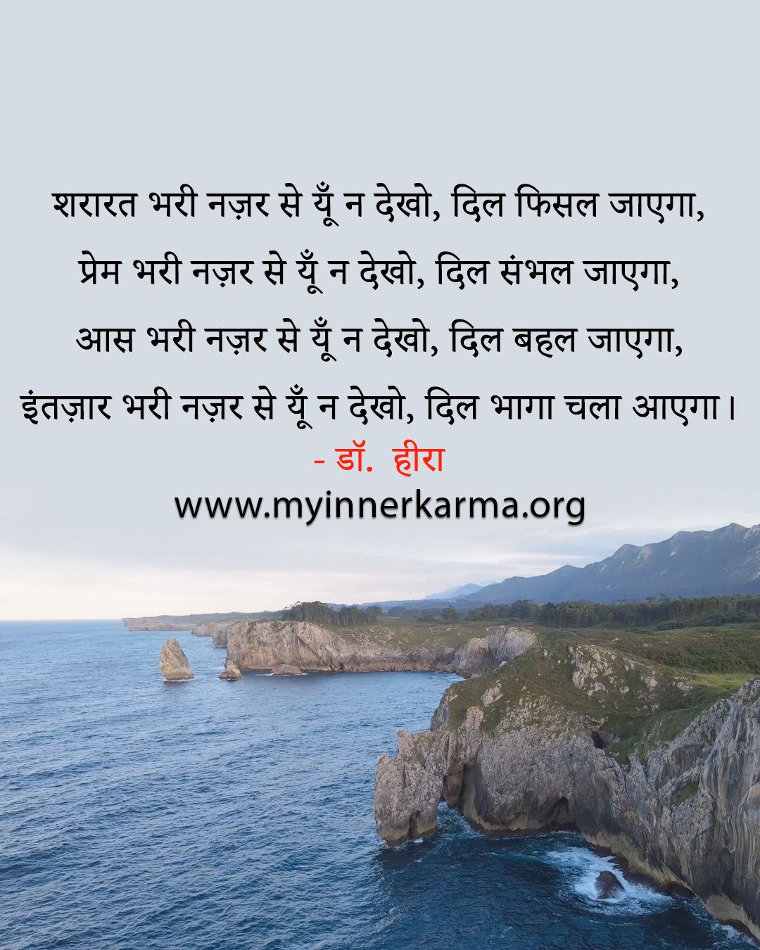 शरारत भरी नज़र से यूँ न देखो, दिल फिसल जाएगा, प्रेम भरी नज़र से यूँ न देखो, दिल संभल जाएगा, आस भरी नज़र से यूँ न देखो, दिल बहल जाएगा, इंतज़ार भरी नज़र से यूँ न देखो, दिल भागा चला आएगा। https://www.myinnerkarma.org/quotes/detail.aspx?title=shararata-bhari-najara-se-yum-na-dekho-dila-phisala-jaega